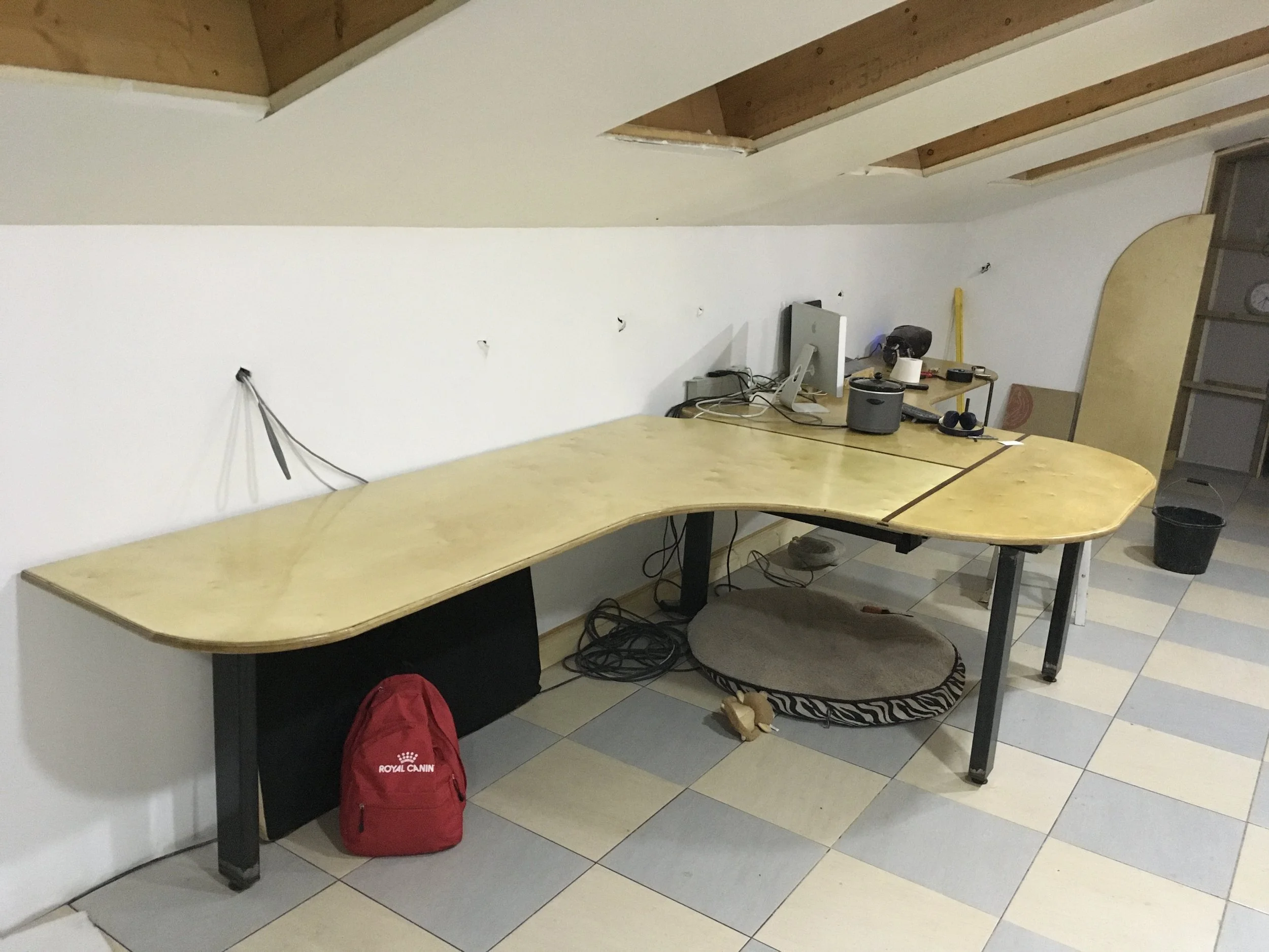 Upstairs there is a large dedicated office (9m by 2.8m) space upstairs where I can work from home, at the end there is a large double door opening out onto a covered balcony looking over the local fields. It has fibre internet with a constant 100Mb/s up and down speed as well as a dedicated UPS. Two very large desks built by myself, with each desk being 1.7m by 2.4m. This creates a nice quiet office environment a short walk from our house as I find this suits me very well as a working environment.