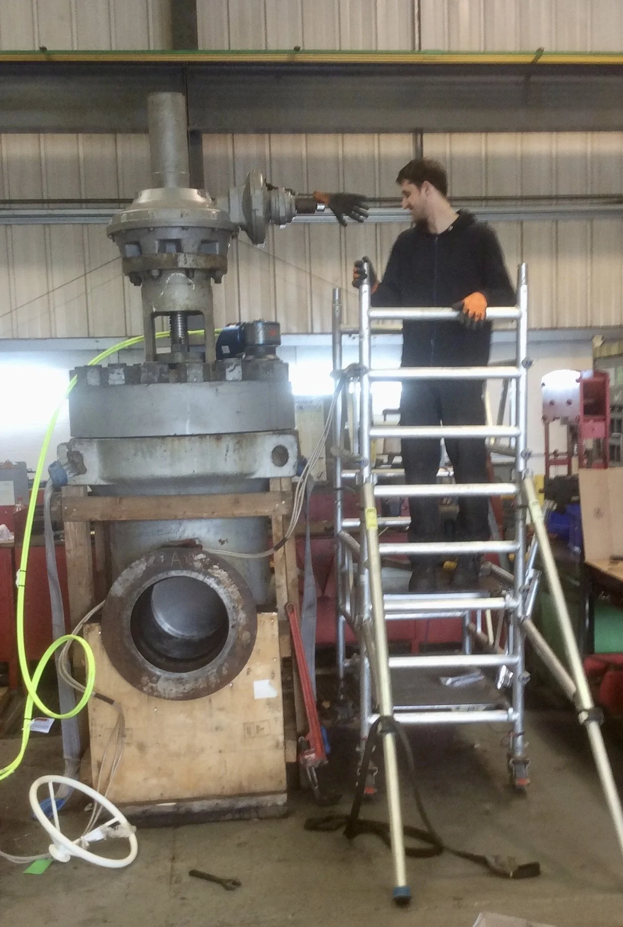 Wayne the valve tech with a large gate valve in CVS workshops