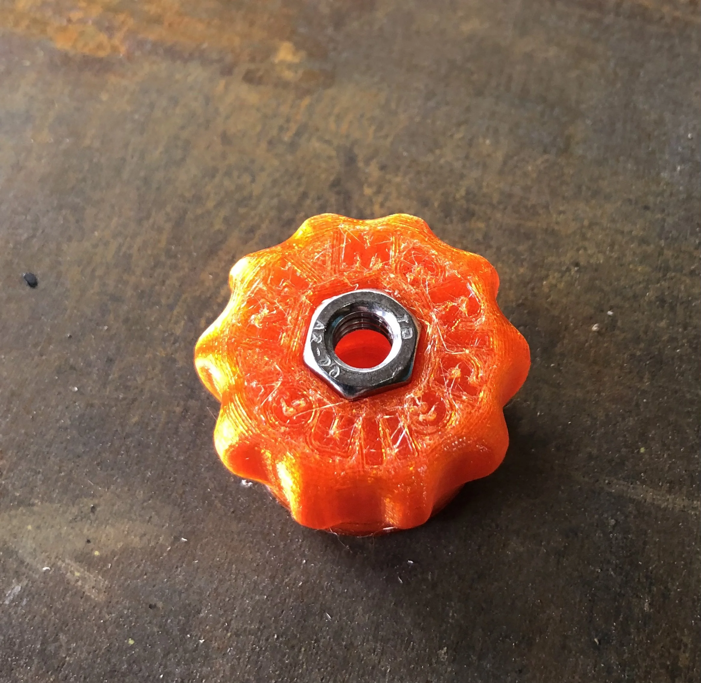Take one M8 nut and push it into the hex hole. if it is a wee bit on the lose side then a dab of glue or use a soldering iron to rough up one wall so it is retained into the knob